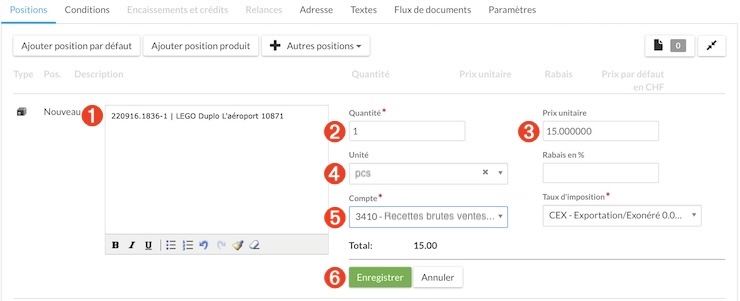 Ajouter le poste par défaut à la facture en cliquant sur Enregistrer➏.